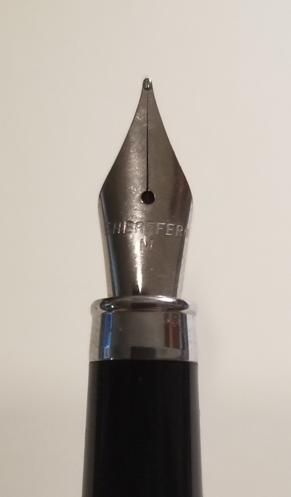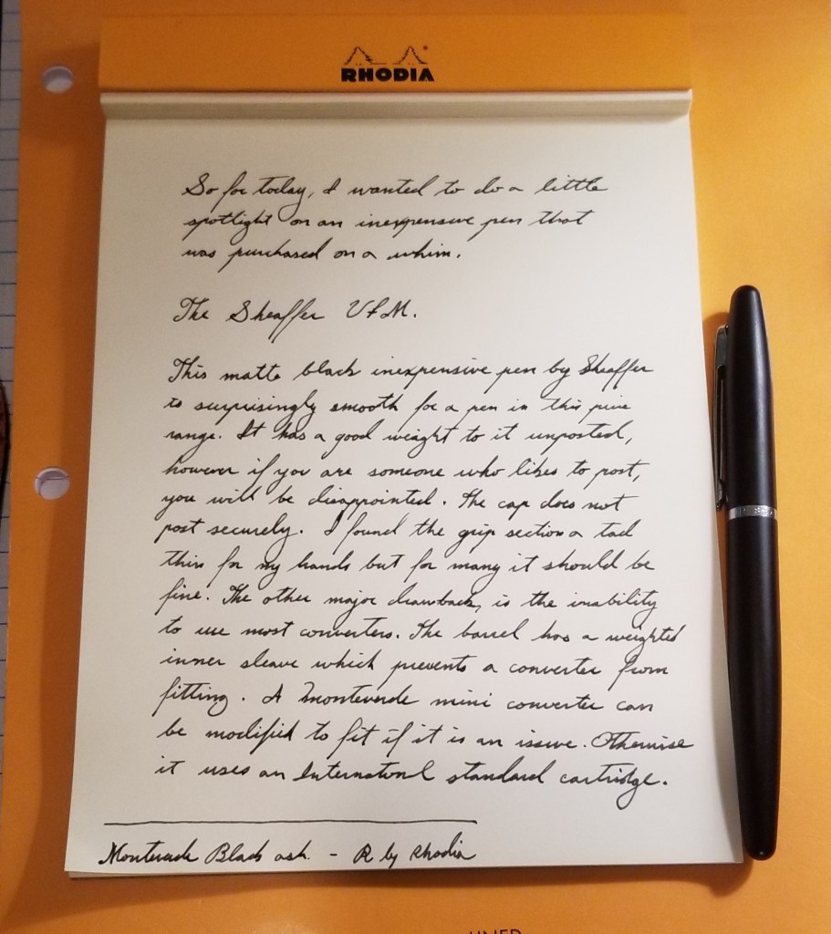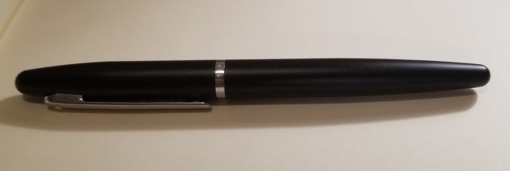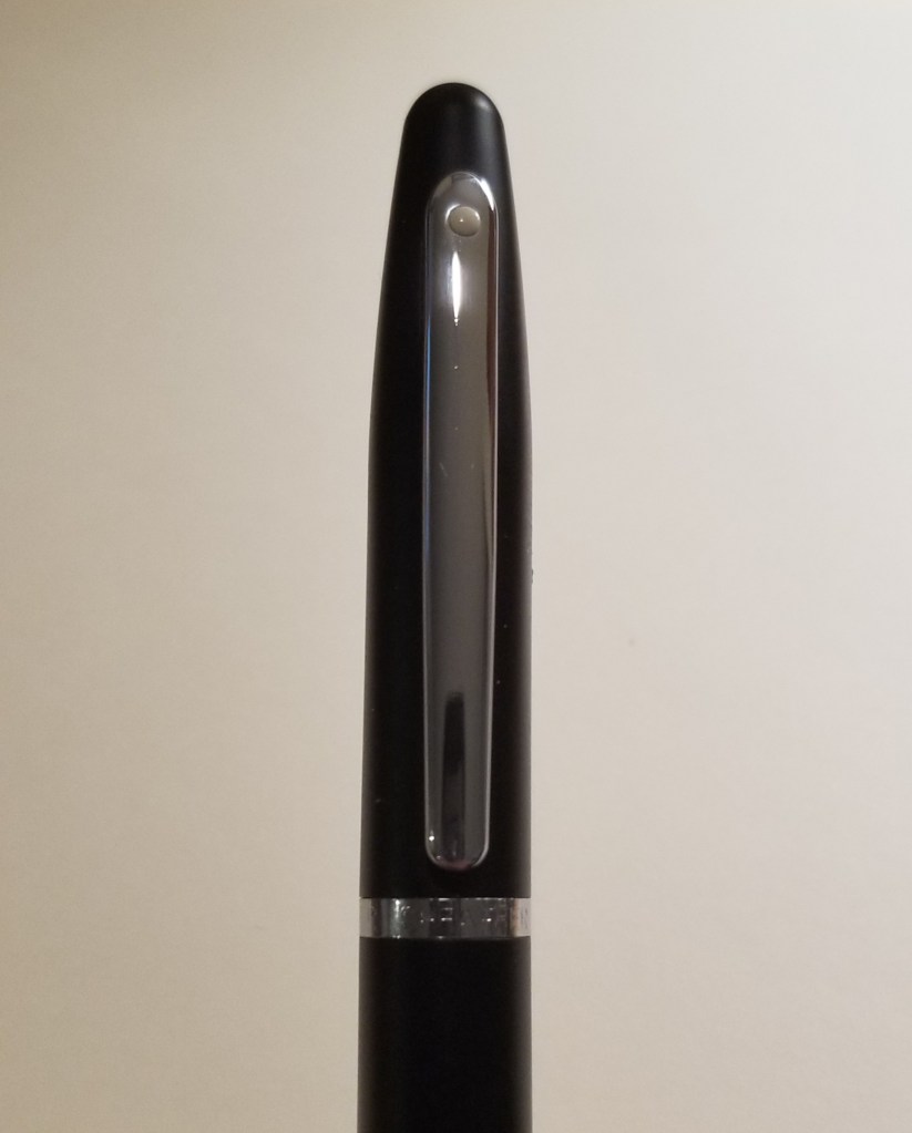 So for today, I wanted to do a little spotlight on an inexpensive pen that was purchased on a whim. The Sheaffer VFM in Matte Black. This was found at a local office supply store for approximately 18 dollars. This simple offering from Sheaffer comes in eight colors but the matte black offers a sleek professional style that would look good in any setting. It has silver colored trim and a white dot on the clip. It is available from retailers with both fine and medium nibs.