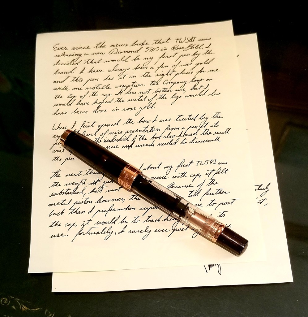 While this pen is more expensive than TWSBI’s other Diamond 580 models due to the added expense and difficulty in the rose gold plating process, my enjoyment of it has outweighed the higher cost. I always love this color combination and the way this writes with its replacement nib has had me reaching for it nearly every day since I received the new nib. For anyone who has been on the fence about the extra cost, the TWSBI Diamond 580 Rose Gold II is really a beautiful pen that looks nicer in person than on the website. It wrote well and comes from a company that stands behind their products without question. I can definitely recommend this pen based on not only form and function, but the reputation of the company who makes it.