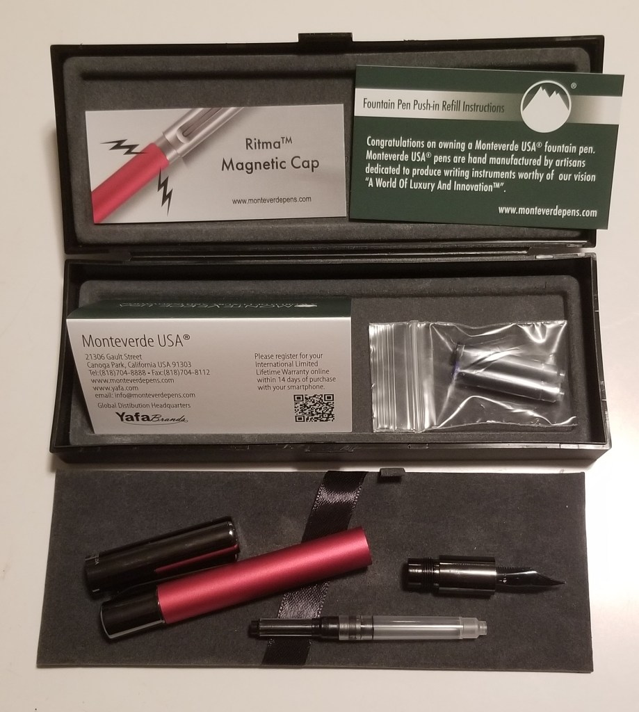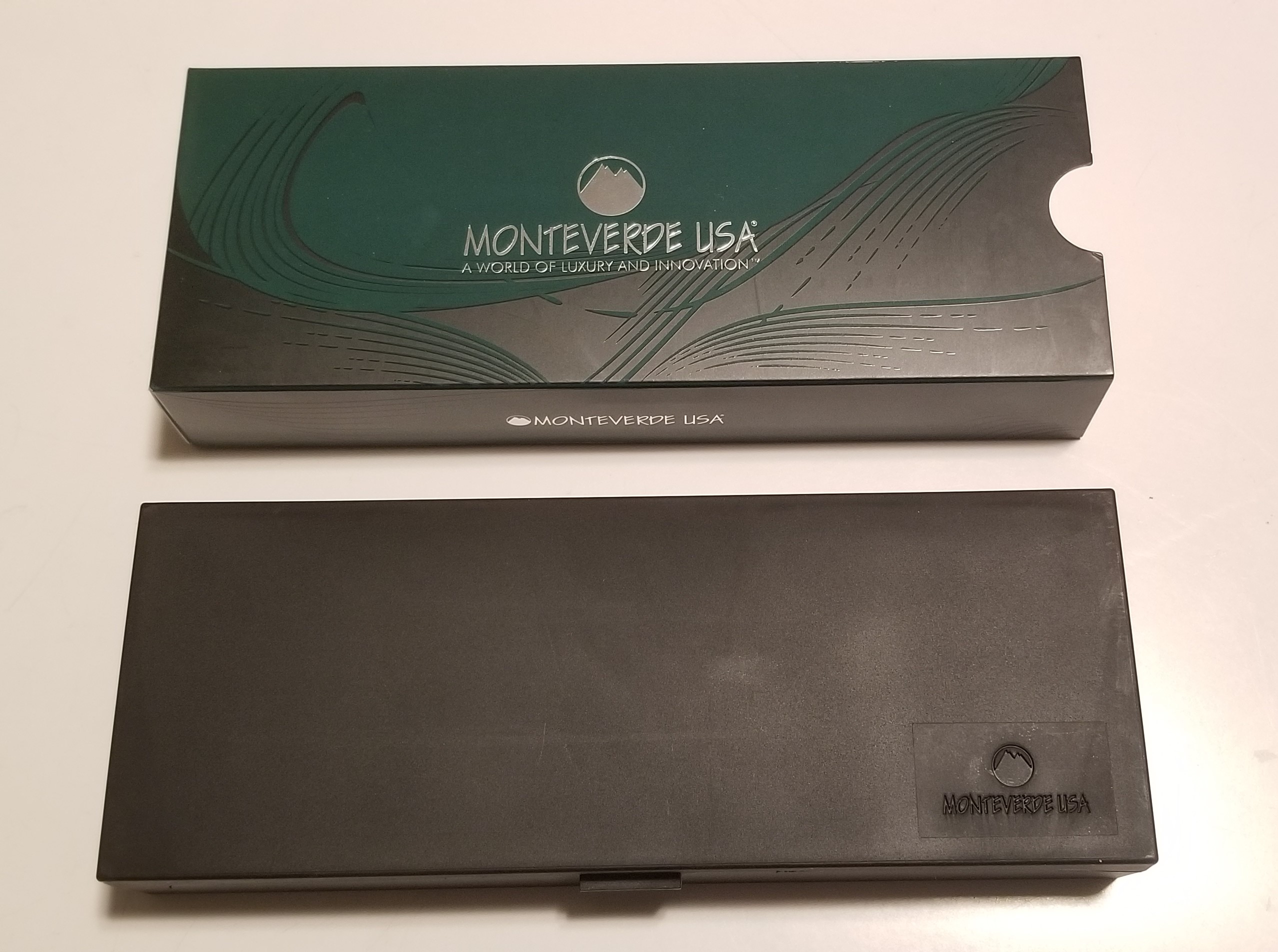 The pen came packaged differently than my other Monteverde pens. It came in a plastic case inside of an outer sleeve which has a beautiful yet subtle design printed on it. Much like the pen, the packaging is simple and not overly fussy. Inside the box, clipped to the pen itself, was a card with information about the magnetic cap. Under the removable tray, is a card with instructions on how to refill the pen using the included cartridges, one blue and one black, or the converter which was inside of the pen. There is also a card explaining the international limited lifetime warranty and a link to register your pen.