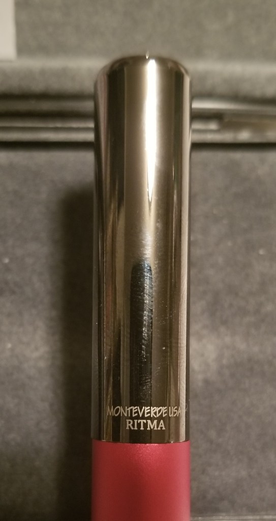 The design of the cap is also very simple with just a few precise details. The top of the cap is slightly concave and on the side of the cap it is etched “Monteverde USA Ritma” The clip is a simple and functional design but is very tight to the body, of the pen. You may need a second hand to hold your shirt pocket when using the clip.
