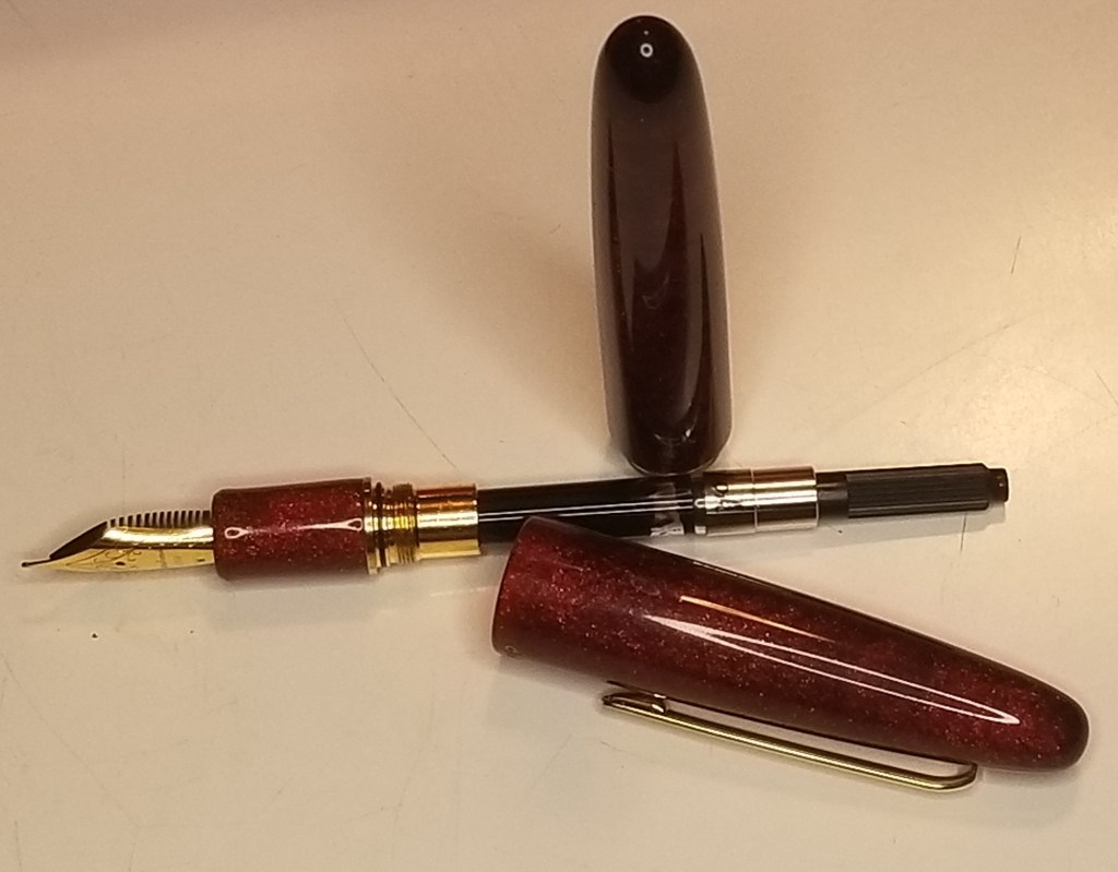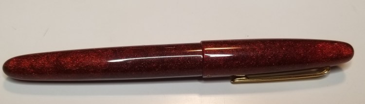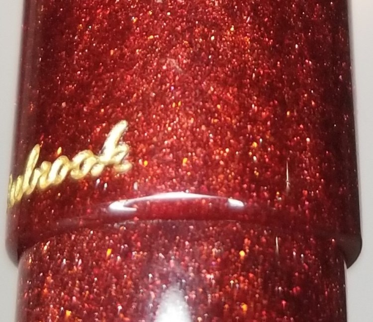 I had a hard time getting a photograph that I thought would really do justice to the material, but I wanted to do my best to show just how much depth it has. This material is unlike anything else I own. From far away the pen looks like an understated red pen with just a little something extra, but close up, this is not just a sparkling top layer on a resin pen. The material itself is translucent and the diamond dust varies in both size and depth and reflects the light and the colors around it. I love how it reflects the gold of the trim and logo which I tried to capture here.