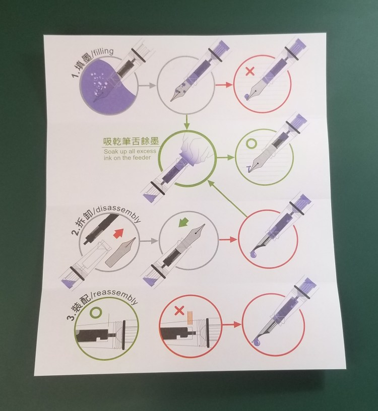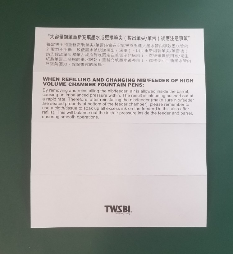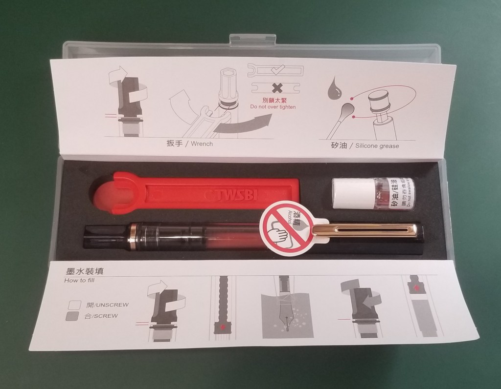 Like any other TWSBI Eco, it comes in the usual plastic case which includes a set of disassembly, maintenance, and filling instructions. The instruction set is quite clear and useful for anyone needing to service the pen.